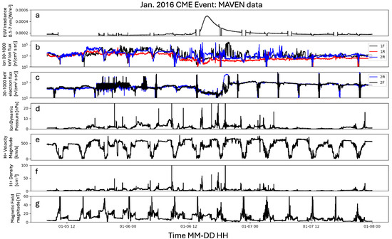 Figure 3 shows MAVEN key parameter data from several instruments for the 1 January 2016 event. Enhancements are visible in the EUV irradiance for the 0.1–7 nm bandpass, the electron and ion 30–1000 kev fluxes, the ion dynamic pressure, and the H+ density. The 1F, 1R, 2R, and 2F refer to the two dual SEP sensors and their field of views, where “F” is Forward (spacecraft +Z) and “R” is Reverse (spacecraft −Z). The plot shows the field of views with the most change in particle flux.