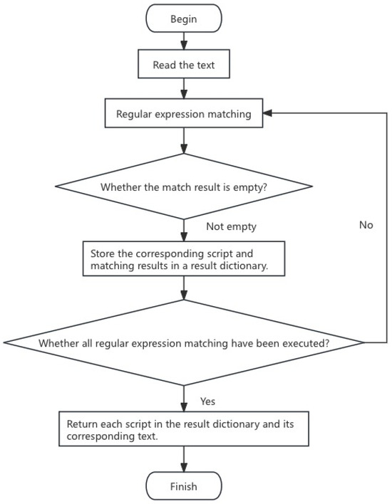 - The text matches the regular expressions of all scripts separately. Replace consecutive spaces in each match with a single space. Also filter out space at the beginning and end of the text. This is because the regular expression of every script contains the encoding of a space. As a result, there will be consecutive spaces in some matches. The purpose of matching is to determine if there is relevant script content in the text. If the matching result is empty, it means that the text does not contain the content described in the corresponding script. If the script is not empty, it means that the text contains the content described in the corresponding script, and the matching result and the corresponding script are stored in the dictionary.