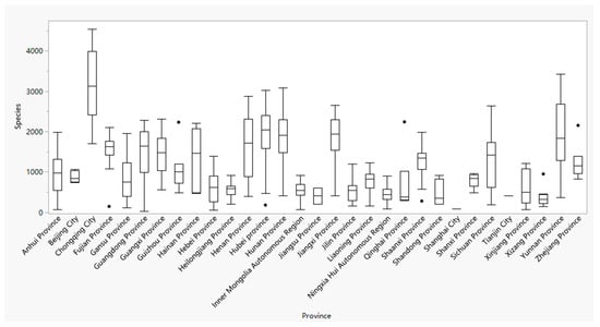 Boxplot of the range of species numbers in each province. Box plots show the medium (black line), and 5% minimum and 95% maximum (bars).