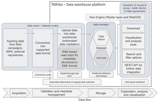 The data flow in the TMFdw is depicted in Figure 2 and Figure 3. In general, unstandardized and heterogeneous data with different data acquisition methods through instruments or manual collection must be transformed through conversion and manual or automatic preprocessing to standardized and homogeneous datasets in the data warehouse. First, standardized EML metadata need to be generated by the data provider as follows: Who has collected What data When and Where, and Which methods were used. The interface provides a general block of metadata, which includes the Who, When, and Where, and a section of metadata for each attribute (column) that should contain information about measurement methods and instrumentation. After that, data can be uploaded in CSV format for tabular data, GeoTiff is used for raster data and shape files are used for vector data. The user has to only create a dataset for this type of data once manually in the data warehouse and can set up an upload script to attach new data to this dataset via this interface and the unique resource ID. Of course, the attributes of the new data have to match the ones in the existing dataset. For logger data, e.g., from our automatic weather stations (AWS) in the study area that need to be uploaded continuously, we implemented an automated uploading possibility via a REST interface and an automatic quality control [].