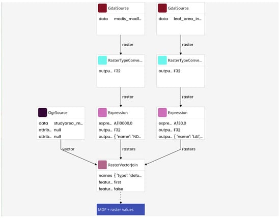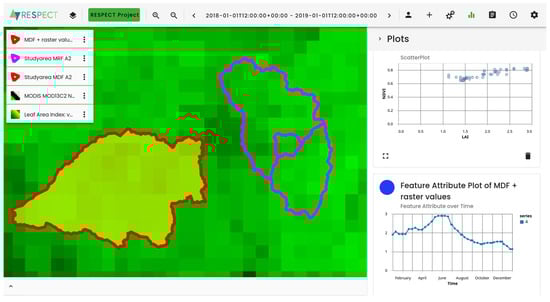 As an example, we can obtain Sentinel-3 LAI (Leaf Area Index) and MODIS NDVI products from the raster engine’s data catalog (cf. Figure 6). We can display them on top of each other but also side by side. Figure 7 shows the workflow computing the mean LAI and mean NDVI value for the study areas polygons of the Mountain Rain Forest (MRF) and the Mountain Dry Forest (MDF) domain. On the right, two plots over the derived time series are displayed. On the top, a scatter plot of the LAI and NDVI for the domains is shown. At the bottom, the LAI values of the MDF are plotted over time. The workflow in Figure 7 shows how the raster data are combined with the polygon data.