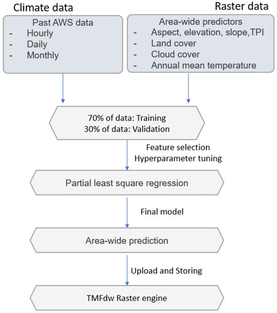 In a survey, the members of the Research Unit RESPECT, which focuses on interdisciplinary biodiversity research programs, were asked what kind of support they expected from the new TMFdw. They unanimously favored a use case that would make it possible to generate spatially high-resolution microclimate data of the study area from the point data of the program’s automatic weather stations (AWSs). These data should be used to enrich and jointly evaluate biodiversity data from any study plot that do not have their own AWS. The most important and thus target variables from an ecological point of view are air temperature, precipitation, air humidity, and solar radiation. The approach uses the tabular AWS data measured in the past and stored in the TMFdw to train and test models with spatial predictors. The models shall then be automatically applied to the continuously incoming AWS data so that the automatic upload of the AWS data from the study area results in a continuous generation of high-resolution microclimate raster data for the entire study area (Figure 8).