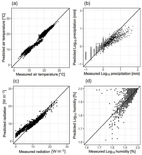 Results of daily microclimate models—measured vs. predicted parameters. (a) Mean daily air temperature in °C; (b) daily log10-transformed precipitation total in mm; (c) mean daily radiation in W m−2; (d) mean daily log10-transformed humidity in %.