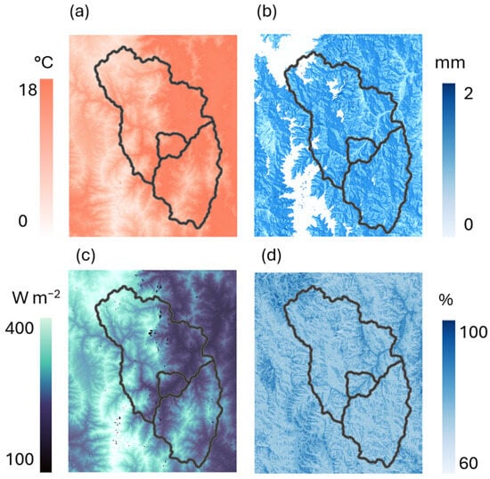 Spatial prediction of the parameters using the daily PLSR model for 15 April 2022 at a resolution of 30 m. (a) Mean average air temperature; (b) precipitation total; (c) mean average solar radiation; (d) mean average relative humidity. The black line indicates the MRF study domain of the research unit.