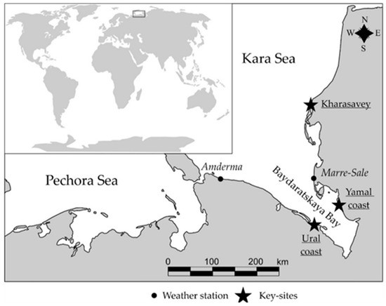 The tide height on the Ural coast is up to 1.1 m, and on the Yamal coast, it is up to 0.8 m [28], and the average tidal height on the Kharasavey coast is 0.6 m [29]. The sea level can rise by 1.4–1.5 m during autumn surges and storms [28,29].