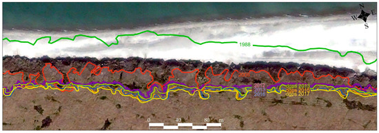 Bluff top position on the Ural coast, in the eastern part (see Figure 1), at various times. The background is from QuickBird-2 2005.