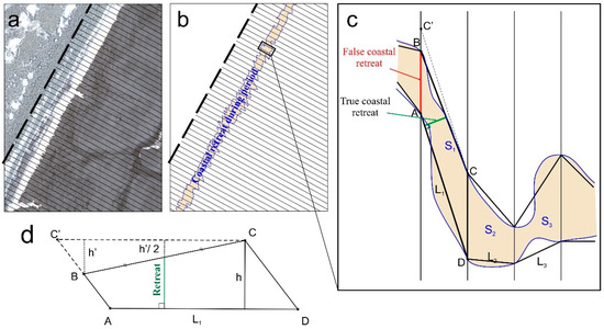 Methodology of coastal retreat estimation: (a)—general view (background is ALOS PRIZM 2006), (b)—general view with transects, (c)—detailed view of several transects, (d)—explanation of the text above.