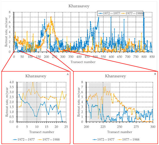 Coastal retreat rates for the Kharasavey key site during different time periods. (A,B) show more detailed sections of the coast (distances on the abscissa between points are 10 m). The grey color highlights the "peaks".