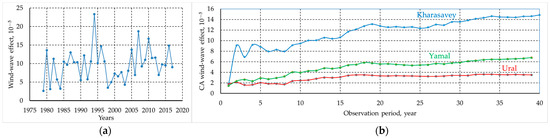 Wind–wave energy: (a) values for the Kharasavey key site in each year [18]; (b) the cumulative average of the values for all sites versus the observation period.