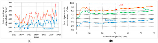 Sum of positive air temperature: (a) value for Ural and Kharasavey key sites during each year [18,22]; (b) cumulative average of values for all sites versus observation period.