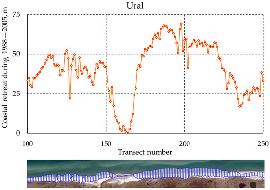 Illustration of correlation in coastal retreat value on neighboring transects on Ural coast. Coastal offset values change systematically when moving along coastline. Blue lines—transects.