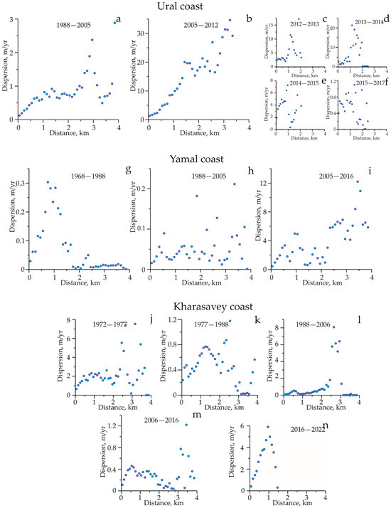Experimental semi-variograms of coastline retreats. For Ural coast (a–f): (a)—1988–2005, (b)—2005–2012, (c)—2012–2013, (d)—2013–2014, (e)—2014–2015, (f)—2015–2017; for Yamal coast (g–i): (g)—1968–1988, (h)—1988–2005, (i)—2005–2016; for Kharasavey (j–n): (j)—1972–1977, (k)—1977–1988, (l)—1988–2006, (m)—2006–2016, (n)—2016–2022.