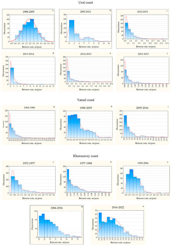 The distribution of coastal retreat rates for chosen key sites. For Ural coast (a–f): (a)—1988–2005, (b)—2005–2012, (c)—2012–2013, (d)—2013–2014, (e)—2014–2015, (f)—2015–2017; for Yamal coast (g–i): (g)—1968–1988, (h)—1988–2005, (i)—2005–2016; for Kharasavey (j–n): (j)—1972–1977, (k)—1977–1988, (l)—1988–2006, (m)—2006–2016, (n)—2016–2022.