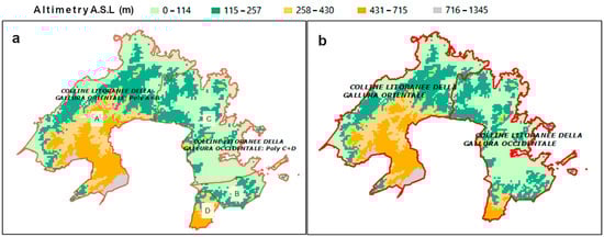 Figure 2a) whose territorial continuity is interrupted by the AR denominated “COLLINE LITORANEE DELLA GALLURA OCCIDENTALE”, also composed by two polygons (C and D,