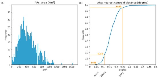 2] and the distance of its centroid to the closest one. We calculated the area and the minimum distance to the nearest neighbor for each AR. The distributions of these variables are shown in