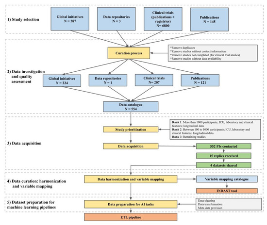 The major objective of this work was to generate a comprehensive data catalogue that contains the data and variables necessary to model the individual progression of COVID-19. To reach our goal, we designed a workflow with five main steps, namely: (1) study selection, (2) data investigation and quality assessment, (3) data acquisition, (4) data curation, harmonization, and variable mapping, and (5) dataset preparation (Figure 1). The corresponding activities of each step are described in
