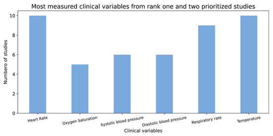 As we can see in Figure 4, the X-axis shows the more common clinical variables, and the Y-axis shows the number of studies in which these variables were measured. Heart rate and body temperature are the two most measured features from over 150 studies, with measurements observed in 10 collected studies.