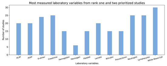 Similarly, several associated COVID-19 clinical and laboratory variables, such as blood oxygen saturation, respiratory rate, neutrophils, lymphocytes, platelets and D-dimer have been reported [20,21]. However, not all of them were measured across the studies that are included in our data catalogue. The charts below (Figure 4 and Figure 5) display the number of studies in which not only these variables but also some other important variables were observed.