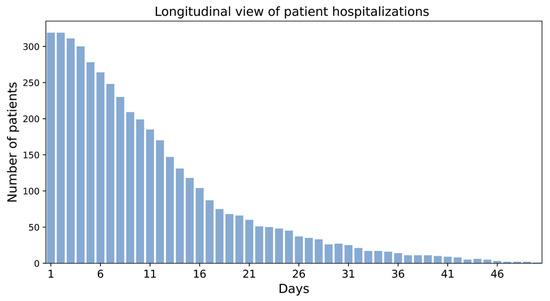 Sample size and event rate: We visualized the longitudinal hospitalization of the patients and thus, by extension, the patient hospitalization outcome (i.e., discharged or died) over the course of hospitalization. While the hospitalization time was less than 14 days for most patients, some stayed up to 50 days in the hospital (Figure 6).