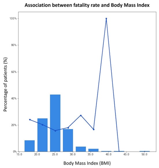The bars in the figure depict the percentage of patients for a range of BMIs, while the line graph displays information on the fatality rate for these patients. The fatality rate for patients with a BMI less than 20 or greater than 30 is the highest among all other BMI ranges.