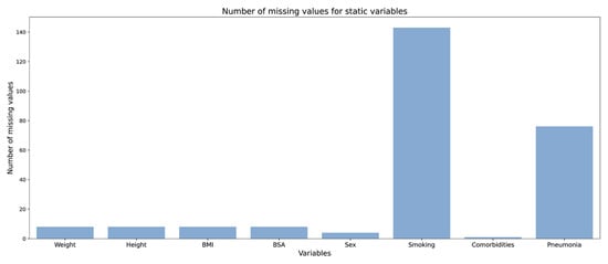 In Figure 9, the X-axis shows static variables, and the Y-axis shows the number of missing values for each variable. Smoking and pneumonia status are missing for more than 30% of patients.