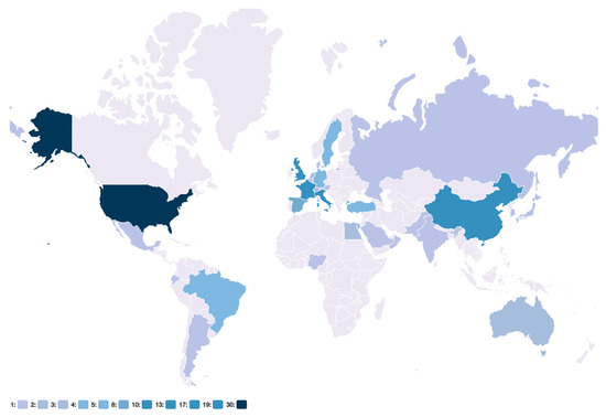 The relative number of studies in each country is highlighted in blue. The underlying data are available at https://github.com/SCAI-BIO/covid-data-catalogue/blob/main/data/general.tsv (accessed on 7 June 2023).