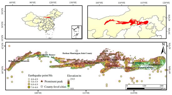 The Yinshan Mountains are located in the central part of the Inner Mongolia Autonomous Region, as shown in Figure 1 [14]. In terms of geomorphology, the Yinshan Mountains rise from the Langshan Mountains and the Wula Mountains in the west, and the central part includes the Xiao–Yin Mountains, in a narrow sense, consisting of the Daqing Mountains and other mountain ranges, and extends to the Manhan Mountains and the Damaqun Mountains in the east. It is geographically important as it is bordered by the Jibei Mountains in the east and the Helan Mountains in the west. The total area of the mountains is 39,729 km2, the total length is about 1000 km, with an average elevation of 1500 to 2000 m, and the main peak is Mt. Huhebashige, located in the Langshan Mountains. The Yinshan Mountains span a considerable distance from east to west, covering regions such as Urad Middle Banner, Guyang County, Wuchuan County, Chahar Right Middle Banner, and Chongli County. Climatically and hydrologically, the Yinshan Mountains are situated in the central Inner Mongolian Plateau, serving as the dividing line between the warm–temperate climate of Inner Mongolia and the temperate climate. Additionally, they play a watershed role between the Pacific outflow system and the central Asian inland drainage [15]. In terms of tectonics, the Yinshan Mountains are located in the western section of the northern edge of the North China Block, the southern part is the Ordos paleo plate, and sandwiched between the two is the Hubao graben system on the northern edge of Ordos [16]. Archean and Proterozoic metamorphic rocks are widely distributed in the Yinshan Mountains [17]. The active fault zones in the area include the Langshan Mountains piedmont fault zone, the Seerteng Mountain piedmont fault zone, the Wula Mountains piedmont fault zone, the Daqing Mountain piedmont fault zone, and the Manhan Mountains piedmont fault zone. According to data from the China Earthquake Networks Center, the Yinshan region has experienced relatively few historical earthquakes, with magnitudes predominantly ranging from 5.0 to 6.9. Earthquakes of magnitude 7 and above have occurred six times in recorded history, with lower magnitude earthquakes being more prevalent in recent years. However, despite the relatively low historical seismic frequency in the Yinshan Mountains, its topographical variations, climatic hydrology, and geological structural characteristics make it a region worthy of in-depth investigation. A comprehensive geological survey and monitoring of the Yinshan Mountains will contribute to a better understanding of the potential geological hazards in the area, providing a scientific basis for future prevention and response efforts.
