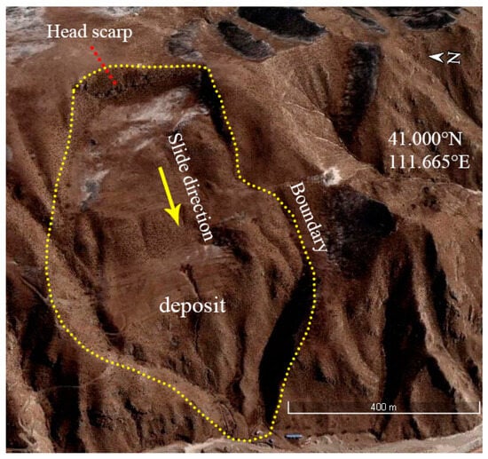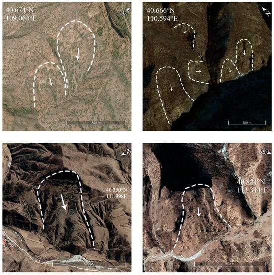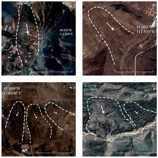In this study, landslide identification based on images taken from the Google Earth platform was carried out in the Yinshan area. The Google Earth platform includes aerial images and high-resolution satellite images (World View-1, World View-2, and GeoEye-1), with resolutions reaching up to 0.5 m. Making full use of the high-resolution remote sensing images and three-dimensional geomorphological information provided by Google Earth, this study successfully realized the accurate identification of landslides and circled the identified landslides as polygons (Figure 2). To ensure that no potential signs of landslides were overlooked, the Yinshan Mountains were divided into three smaller regions: Langshan District, Xiao–Yin Mountains District in a narrow sense, and the Manhan Mountains, Damaqun Mountains, and surrounding mountainous areas [10,14]. The entirety of the Yinshan Mountains was divided into 19 areas measuring 1° × 1°, and we used the Google Earth grid tool to keep the viewing angle constant to conduct refined landslide identification. The recognition process was mainly undertaken by observing various types of features on the images, as shown in Table 2 [33], including the following: (a) topographical features, i.e., whether there are noticeable deformations on the surface; (b) vegetation coverage features, such as the distribution of vegetation and whether its color differs significantly from the surrounding areas; (c) soil characteristics, i.e., whether the soil appears loose, collapsed, or piled up; and (d) river features, as landslides may lead to the obstruction of water bodies or alterations in the direction of water flow. This study comprehensively considers these features to ensure the comprehensive observation and accurate assessment of landslides.