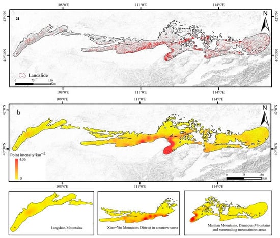 Distribution and density analysis of landslides in the Yinshan Mountains. (a) Landslide distribution. (b) Density distribution of landslide points.