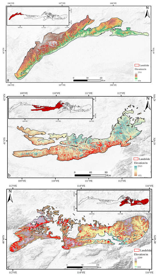 To present the landslide distribution in more detail, this study divided the Yinshan Mountains into three regions and illustrated the landslide distribution within each region (Figure 4). In the Langshan Mountains (Figure 4a), landslides are relatively scarce, totaling 331 occurrences with a combined area of 11.96 km2. The minimum landslide area is 1326 m2, and the maximum is 0.71 km2. In the narrow sense of the Xiao–Yin Mountains (Figure 4b), landslides are predominantly concentrated in the southern part of the Daqing Mountains, totaling 3393 occurrences with a combined area of 64.13 km2. The minimum landslide area is 84.47 m2, and the maximum is 0.46 km2. In the Manhan Mountains, Damaqun Mountains, and other scattered mountainous areas (Figure 4c), landslides are most concentrated, accounting for over 65% of the interpreted total. In this region, 7244 landslides were recorded, covering a total area of 232.85 km2. The minimum landslide area is 103 m2, and the maximum is 2.95 km2. This further reveals the variability in landslide distribution across different regions. The high landslide density in this area may be influenced by various geological and topographical factors, necessitating further research to elucidate the specific mechanisms driving landslide activity. Overall, these detailed landslide distribution data provide a crucial foundation for geological hazard risk assessment, early warning system development, and geological hazard prevention and control efforts.