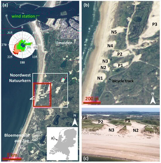 The five NWNKern notches, labelled N1 to N5 from south to north, are located in an approximately 1 km stretch of the 20 m high established foredune between Bloemendaal aan Zee in the south and IJmuiden in the north (Figure 1a). In recent decades, the beach sediment budget has been moderately positive [,], mainly due to the impact of the 2.5 km long IJmuiden harbour moles on waves and currents near the coast and probably also related to various sand nourishments on the beach of Zandvoort aan Zee, 6 km to the south. The foredune borders a low-gradient intertidal beach and an upper beach with incipient foredunes up to 2.5 m high (embryo dunes) on its sea side and an ≈5 km wide dune system with vegetated parabolic dunes and dune slacks on its land side. Vegetation was removed from several parabolic dunes as part of the NWNKern project [,] (e.g., P1–P3 in Figure 1b,c). Most of the national park is part of the European Natura 2000 network of protected nature areas. The most common habitat types in the vicinity of the notches are the aforementioned White (H2120) and Grey (H2130) dunes, together with “dunes with sea buckthorn Hippophae rhamnoides” (H2160, often together with wild privet Ligustrum vulgare) and “humid dune slacks” (H2190) []. The sediment consists of medium sand, with the median grain size fining from 300 to 350 μm on the beach to 250–300 μm in the notches.