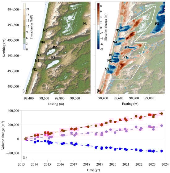 All ALS point clouds except 2015-02-13 were collected as part of the annual Coastal Lidar campaign of the Dutch government organisation Rijkswaterstaat [,,] and are publicly available in LAZ format from https://downloads.rijkswaterstaatdata.nl/, accessed most recently on 30 January 2024. The 2015-02-13 survey was commissioned by PWN, the nature manager of the study region, and the acquired data were provided as ASC Arc/Info ASCII grids with 0.5 m resolution. For the purpose of the present work, these files were merged and converted to LAZ format. The PWN-commissioned survey also resulted in an orthomosaic of the NWNKern region. ALS surveys were generally conducted in January, February, or March, prior to the start of the growing season. The point clouds were corrected for vegetation and additional off-terrain objects by the commercial contractors who performed the data collection. The horizontal coordinates are in the Amersfoort/RD New system (EPSG:28992) and the elevation is with respect to NAP. Data quality documents illustrate that elevation data meet the requirements of Rijkswaterstaat, having a bias less than 0.05 m and a standard deviation less than 0.1 m. Because the focus of the annual campaign until 2022 was on the beach and the foredune, the most landward part of the depositional lobes was missing from the point clouds. Inquiries with Rijkswaterstaat revealed that Lidar data points have been collected landward of the foredune since 2016 but have not been processed as standard into the publicly available point clouds. For the present data set, these additional points were made available and merged with the point clouds of the beach and the foredune. Rijkswaterstaat indicated that the quality of these additional data may deviate from the requirements. The 2008 and 2014 ALS point clouds do contain high-quality data points landward of the foredune, because these surveys were carried out simultaneously with the second and third national-scale AHN campaigns (https://www.pdok.nl/introductie/-/article/actueel-hoogtebestand-nederland-ahn, accessed most recently on 30 January 2024). From 2023, Rijkswaterstaat expanded the area for lidar data collection and processing in the NWNKern region far landward of the depositional lobes. Each ALS point cloud was processed into a DEM in the same way as described for the UAVSfM point clouds.