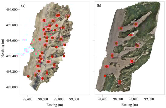 Orthomosaics of the (a) 2017-03-15 and (b) 2023-09-25 surveys. The red dots are the locations of the ground control point (GCP) targets used in the Structure-from-Motion workflow, described in Section 3.1. Panels (a,b) contain 37 and 10 GCPs, respectively.