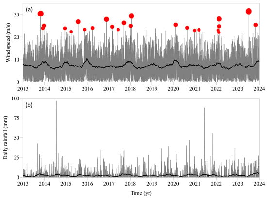 Time series of meteorological data for the NWNKern region 2013–2023: (a) wind speed at IJmuiden WMO 06225; grey lines are 10-min average values, dark line is 90-day moving average, and red dots are storm events for which at least 6 consecutive 10-min wind speeds exceed 20.7 m/s (i.e., event duration is at least 1 h). The dots are plotted at the peak of the storm and scale with peak wind speed. (b) Rainfall at Wijk aan Zee WMO 06257; grey lines are daily amounts, and dark line is 90-day moving average. The shown time period is the same as in Figure 2c.