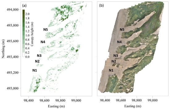 Although the previous paragraphs considered vegetation-induced bias in DSMs as a potential limiting factor for their use, a canopy height map, as presented in Figure 5a, is also an important derivative of the current data set and provides opportunities for new research. A map with similar spatial extent and resolution will be virtually impossible to make on the basis of vegetation ground surveys. Potentially, a canopy height map can be used to train and test a machine learning algorithm, such as that presented in [], to predict and remove vegetation-induced bias in a DSM, in other words, to correct it to a DTM. Another use may be to aid in the prediction of habitat maps from orthomosaics using deep learning. The author of [] used a Convolutional Neural Network (CNN) with U-net architecture to predict a habitat map from the orthomosaic of 22 March 2022 (with 75% accuracy), with training and testing data derived from vegetation surveys in the field and subsequent visual interpretation of the orthomosaic. Other studies [,] have shown that including elevation in the machine learning algorithm can improve the accuracy of prediction. The author of [] did not obtain any improvement by including elevation, possibly because the habitats in the study region are not limited to unique elevation ranges. Instead, she suggested including cross-shore distance due to the zonation of coastal dune habitats with the distance to the beach [,,,]. Figure 5a suggests that including the height of the canopy in the machine learning algorithm can also improve the accuracy of habitat predictions, as habitats have different canopy heights.