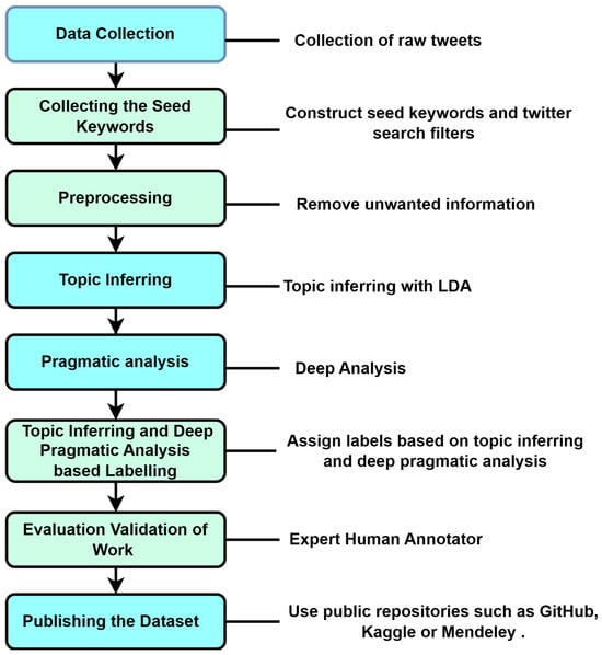 The steps below will explain the methodology. It can be observed from the Figure 1 that the methodology consists of 8 steps. The first step is to define the scope for the collection of data. The second step is to construct seed keywords and search filters for the extraction of data. The third step is to run pre-processing operation on the tweets. In fourth step topic analysis with the help of algorithms such as LDA is done.From the outcome of LDA, the fifth step is convert pragmatic analysis based on 5 principles. The sixth step is assign labels based on topic inferring and deep pragmatic analysis.The seventh step is to validate the label with human expert evaluation. The eighth step is to publish data after validating through a case study.