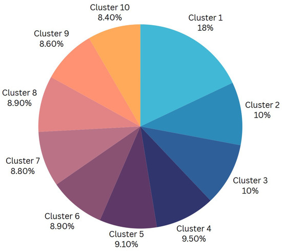 The distribution of tokens across clusters reveals that the topics are not evenly distributed. The first cluster holds the highest percentage of tokens at 18%, indicating it covers a larger portion of the dataset or a more prevalent topic. In contrast, the tenth cluster contains the smallest percentage of tokens at 8.4%, suggesting it might represent a more niche or less discussed topic. The remaining clusters have relatively similar percentages of tokens, ranging from 8.6% to 10%, indicating a more balanced distribution of content among them.