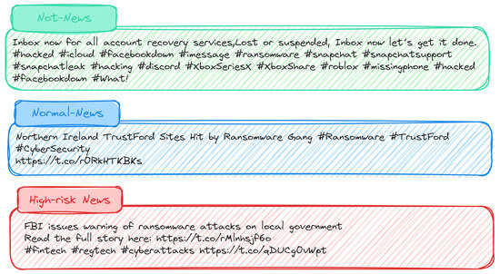 - High-risk-news class: It is an alert announced by an official agency about an expected occurrence of attacks or a wide spread of current attacks. It is also a cybersecurity event that is described by an official agency as a highly dangerous or harmful one.