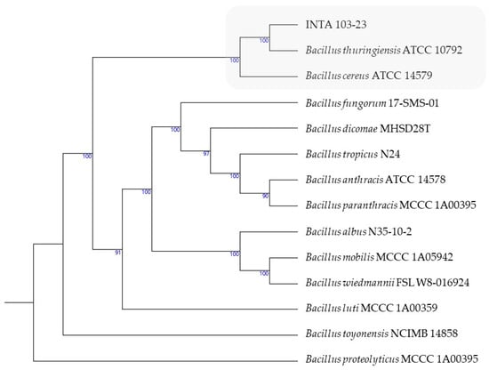 Palma, L.; Ortiz, L.; Niz, J.; Berretta, M.; Sauka, D. Draft Genome Sequence of Bacillus thuringiensis INTA 103-23 Reveals Its Insecticidal Properties: Insights from the Genomic Sequence. Data 2024, 9, 40. https://doi.org/10.3390/data9030040