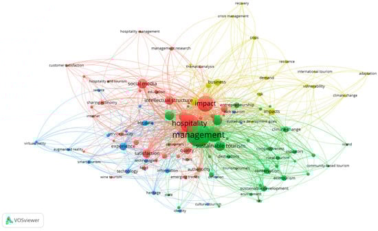 Cluster 1 (red) represents the backbone of the tourism industry with terms such as “management” [,], “hospitality” [,], “impact” [], “satisfaction”, “social media”, “customer satisfaction” [], and “hotel”. These terms suggest that much of the existing tourism bibliometric research focuses on hospitality management and impact assessment [].