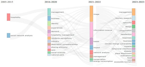Figure 2 shows the thematic evolution of bibliometric articles in tourism. There has been a progressive increase and diversification of the topics subject to bibliometric analysis from 2005 to the present. Within the framework of this study, it should be noted that in the recent period 2021–2022, the thematic category “information science” stands out, in which most of the references specifically related to the use and exploitation of tourism information are grouped.