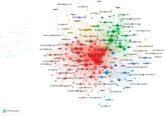 Map of the co-occurrence of keywords in the field of bibliometrics and tourism. (Note: The graphic was created using VOSviewer software version 1.6.20). Each node’s size correlates with the frequency of the keyword’s appearance, meaning a larger node indicates a more frequent presence in the authors’ keywords. The overall spacing between nodes reflects their interrelationship, with closer nodes signifying a stronger connection. The importance of terms is assessed by tallying their occurrences in keywords. The colors show the clusters.