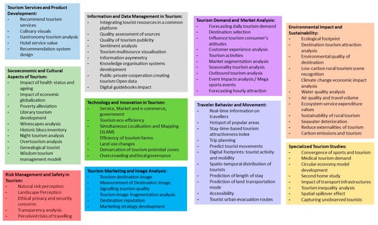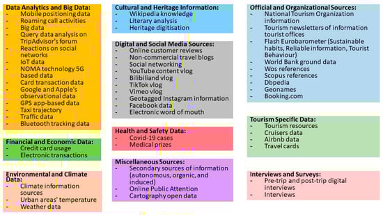 Li, Xu, Tang, Wang, and Li (2018) [] identify different types of data in tourism analytics, which they divide into three main categories: UGC (user-generated) data, including online textual data and online photo data; device data, comprising GPS data, mobile roaming data, Bluetooth data, etc.; and transaction data (by transactions), including data from web searches, website visits, and online bookings, among others. Each type of data carries different information and addresses different tourism issues.