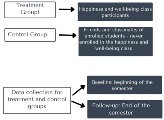An online survey was administered to class participants (treatment) and non-class participants (control). At the beginning of the semester, class participants filled out an online survey, and identified a friend or classmate not taking the positive education class. At the end of the semester, students in the treatment and control group were asked to respond to a follow-up online survey.