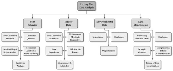 In luxury car data analysis, data are not just tools; they are the brush and canvas upon which the most lavish automotive experiences are painted. The profound transformations in the automotive industry are nowhere more vividly illustrated than in the world of luxury automobiles, where every data point is a brushstroke on the canvas of opulence []. This literature review is divided into five distinct sections, as shown by the taxonomy depicted in Figure 1. Each focused on fundamental components that constitute the foundation of luxury car data analysis: (i) user behavior data analysis, (ii) vehicle data analysis, (iii) environment data analysis, (iv) data monetization, and (v) challenges and opportunities. Understanding the implications of such data analysis is crucial to comprehending how luxury car manufacturers enhance safety, adaptability, and environmental awareness. The rest of the paper is organized as follows: Section 2 is dedicated to data analysis of user behavior and emphasizes the importance of insights derived from luxury car users in personalization experiences and customer satisfaction. Section 3, concerning vehicle data analysis, covers a wide range of data directly collected by luxury cars. Section 4 explores the impact of environmental data analysis on luxury cars, encompassing data derived from the environment and external sources. In Section 5, we discuss various types of data collected from luxury cars and methods of utilizing and converting these data into values. In Section 6, we point to the challenges and opportunities in luxury car data analysis. Some concluding remarks are made in Section 7.