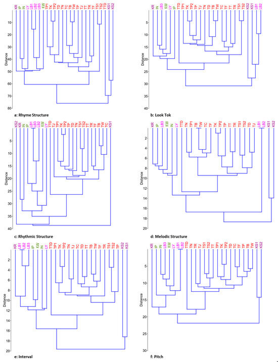 (a–f) Hierarchical cluster analysis diagrams of 20 different versions of Sadhukarn’s main melody [Normalized version] generated by six single parameters consisting of rhyme structure (a), Look Tok (b), rhythmic structure (c), melodic structure (d), interval (e), and pitch (f).