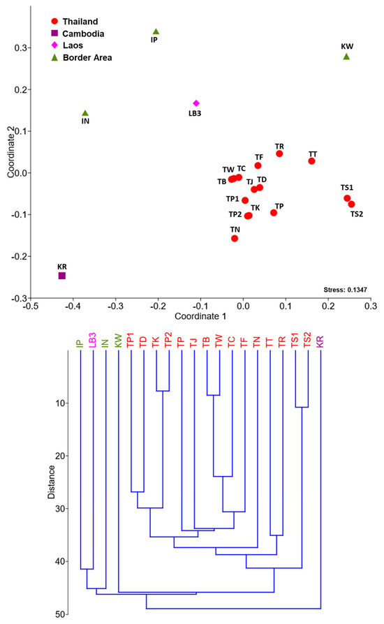 After normalization for the number of music phrases and keys, 20 versions of Sadhukarn remained for further analysis. The results showed that three out of the six music elemental parameters (rhyme structure, rhythmic structure, and pitch) could separate versions of Thai Sadhukarn from other versions from Laos, Cambodia, and the border areas (Figure 4a,c,f and Figure 5a,c,f). It is noteworthy that among these three music parameters, rhythmic structure was identified as the best parameter to use for NMDS and cluster analysis as it tightly grouped and completely separated Thai versions of Sadhukarn from other versions of the other locations (Figure 4a–f and Figure 5a–f). When considering only Look Tok, the Sadhukarn version from Laos (LB3) clustered together with Thai versions, which were completely separate from both Cambodia (KR) and Thai-Cambodian border areas (Thai site) (IP and IN), except KW (Cambodian site) (Figure 5b). When the melodic structure was used, both Sadhukarn versions from Cambodia and Laos (KR and LB3) were grouped with the Thai versions, which were separated from the border areas (Thai site) (IP and IN) (Figure 5d).