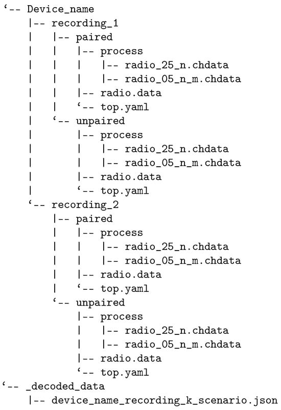 This section describes how to interact with the dataset, including two Python scripts for basic usage. Metadata, example radio and decoded data, and usage examples are available on GitHub 1 (accessed on 28 March 2024). It is not necessary to download the entire dataset to analyze a single recording, but we assume that the downloaded parts follow the folder structure described in Section 2. The following example Python scripts are provided to demonstrate the structure and use of the data.