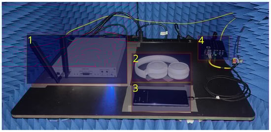 Anechoic chamber with recording setup. Parts of the setup are marked in blue. The USRP X310 (1) serves as a recording device of the Bluetooth connection between the DUT (2) and the Samsung Galaxy S20 FE (3). (3) is connected to the PC via an optically decoupled USB hub (4) while (1) is connected to the same PC via an SFP+ optical transceiver and an optical cable.