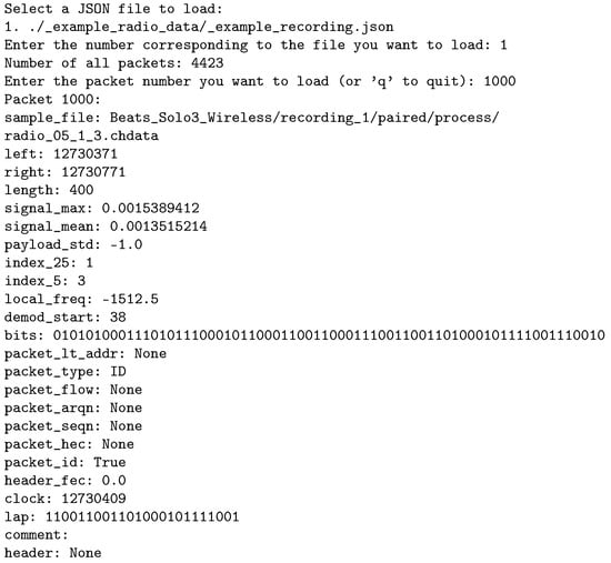The resulting list of decoded packets includes a varying level of metadata (described in Table 3) depending on the success of the decoding steps (e.g., successful detection of an FHS packet may affect the ability to correctly de-whiten the data). We did not implement further packet processing logic based on the packet type, such as phase shift keying (PSK) demodulation for packets with enhanced data rate (EDR) payload parts, but the length of amplitude-based detection of the signal should also include the full PSK payload in the selected packet length.